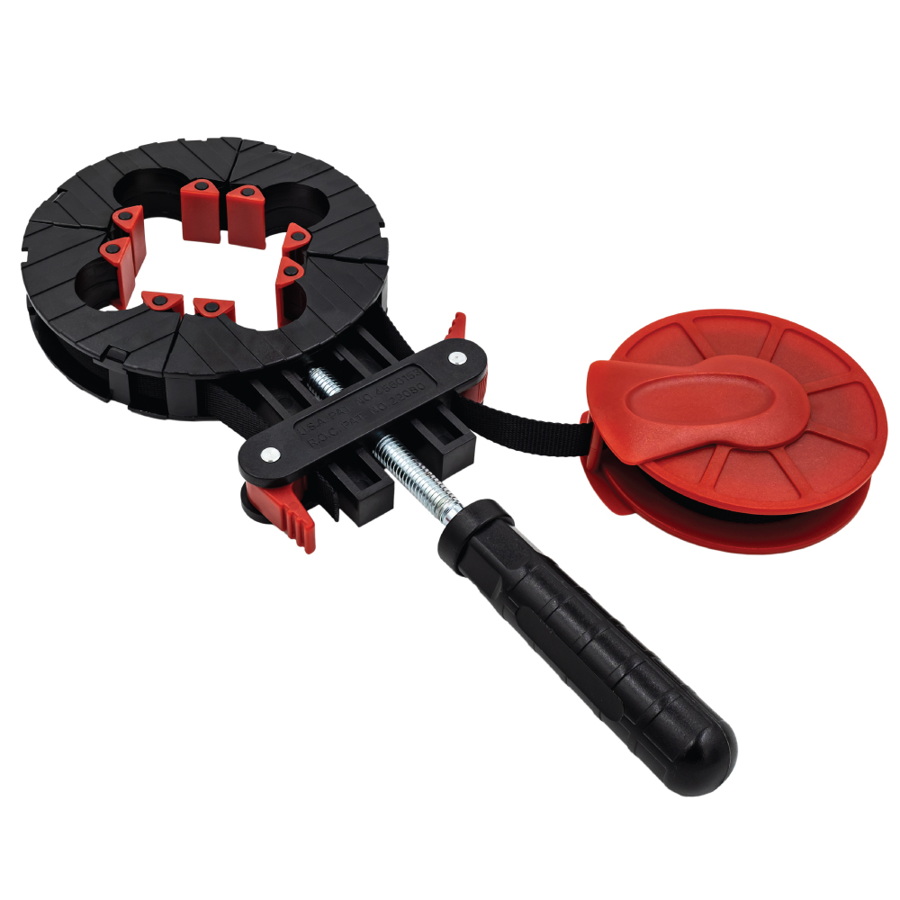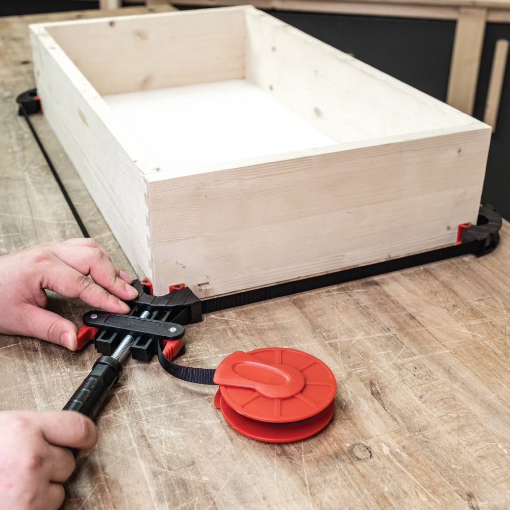 Ein tolles Werkzeug für die Herstellung von kleinen und großen Rahmen in einer kleinen Werkstatt oder für Heimwerker – Ausgestattet mit einem 4 Meter langen Nylon-Spannband, einer Bandwinde, einer Schraubenspannvorrichtung und vier schwenkbaren Ecksegmenten, um den Rahmen perfekt zu spannen. Mit dieser Vorrichtung können Sie rechteckige Rahmen oder sogar unregelmäßig geformte Rahmen spanen. Nach der Applikation des Klebers wird der Rahmen einfach in den Rahmenspanner befestigt und gespannt.