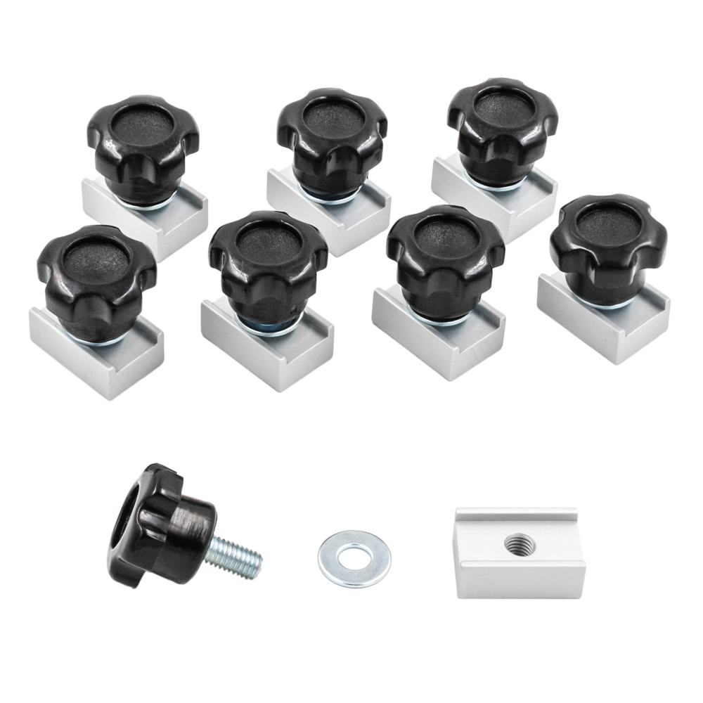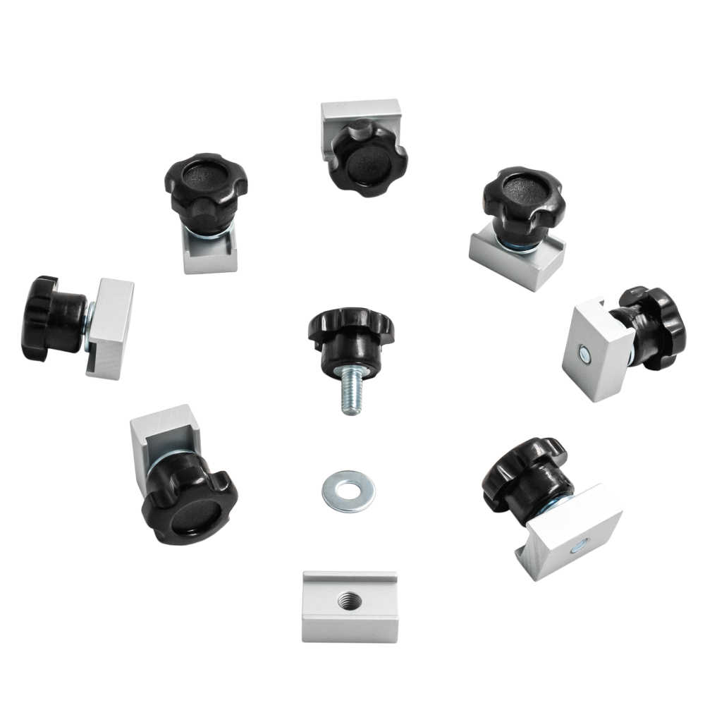Dieses Set wurde entwickelt, um die Einsatzmöglichkeit von Klemmschienen zu erweitern. Legen Sie zwei Schienen übereinander und befestigen Sie sie mit den vier T-Verbindungsstücken. Befestigen Sie die zusammengefügten Schienen mit den unteren Backen an die Tischplatte. Mit dem Klemmsystem der oberen Klemmschiene wir das Werkstück befestigt. Dank des niedrigen Profils der Backen ist die Arbeitsfläche für die Holzbearbeitung, z. B. mit Oberfräse, Schleifmaschine usw., leicht zugänglich. Die beiden miteinander verbundenen Klemmschienen können jederzeit demontiert und separat wieder verwendet werden. Ein Satz von 8 Verbindungsstücken verbindet zwei Paare von Schienen.
