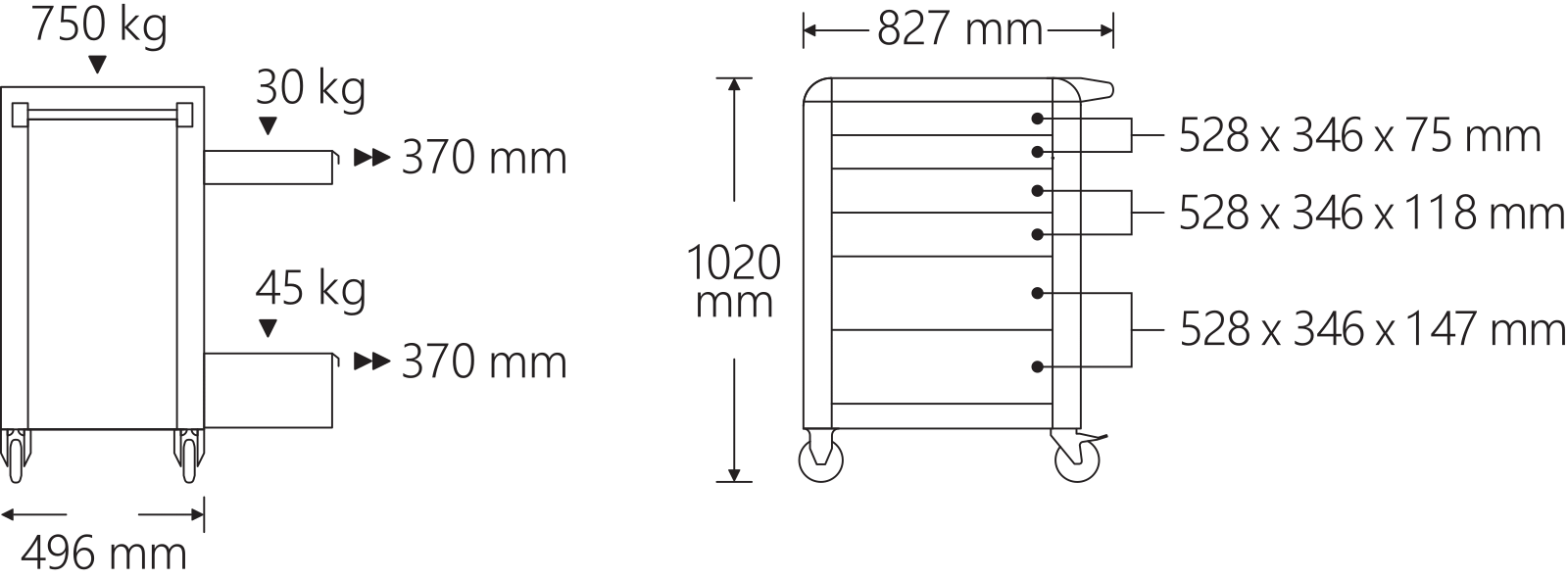 Schubladen-Innenmaße mm 346 x 528 x 75 mm (2x), 346 x 528 x 118 mm (2x), 346 x 528 x 147 mm (2x)
