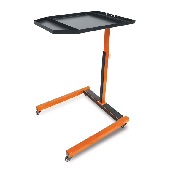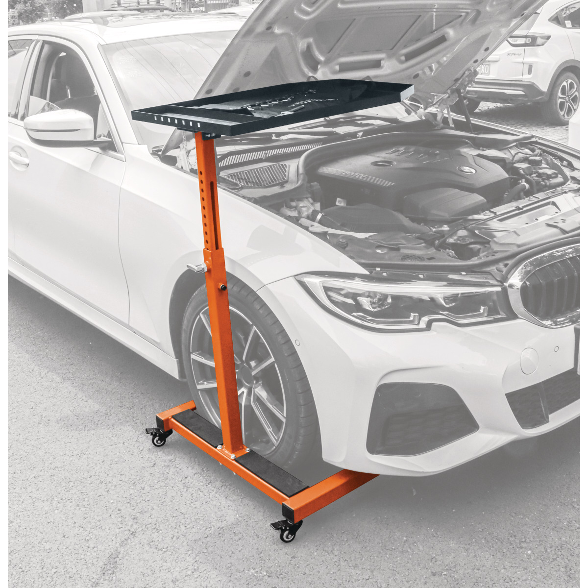 Der von Stürmer Maschinen GmbH hergestellte Ablagetisch, mit einer Tragkraft von 35 kg und Maßen von 750 mm x 522 mm x 28 mm, verfügt über einen Rammschutz an wichtigen Berührungspunkten, ist um 90° klappbar und 15-fach höhenverstellbar im 25 mm Lochraster. Der Tisch ist ideal für die Lagerung von Werkzeug und Ersatzteilen bei Reparaturen und durch zwei Feststellbremsen an den Rollen äußerst stabil. Er eignet sich perfekt für den Transport von Reifen und Ölfässern in Kombination mit dem zusätzlich erhältlichen Ablageboden.