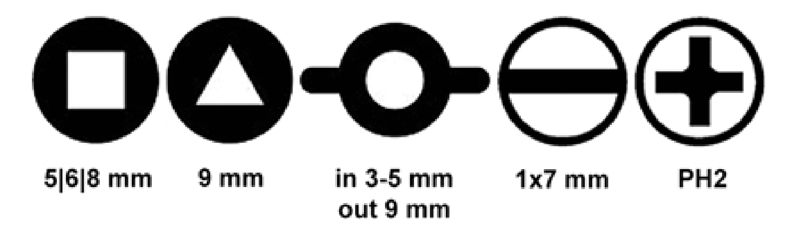 • Funktionen: Innenvierkant 5, 6, 7-8 mm; Innendreikant 7, 9 mm; Doppelbart 3-5 mm