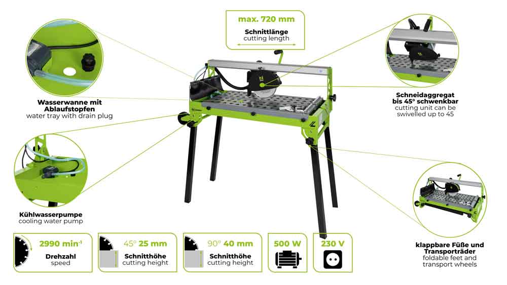 Die ZIPPER Fliesenschneidmaschine ZI-FS200-720 verfügt über eine Ø200 mm Diamantscheibe, Transporträder und eine Kühlwasserpumpe für präzise Schnitte. Mit einer Motorleistung von 500Wm (S1) und 800Wm (S6), einer Drehzahl von 2990 min¹ und einer Tischgröße von 800×420 mm ist sie ideal für Ihre Baustelle. Sie hat eine maximale Schnitthöhe von 40mm bei 90° und 25mm bei 45°, bei einer maximalen Schnittlänge von 720mm. Das Gewicht beträgt 34kg (exkl. Verpackung) bzw. 38kg (inkl. Verpackung).
